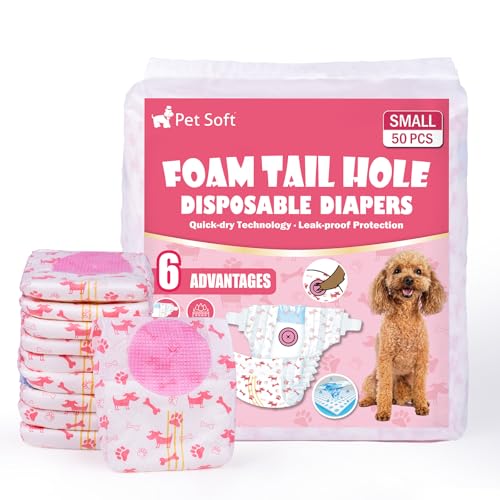 Pet Soft Lot de 50 Couches jetables pour Chien Femelle, Taille S, Super absorbantes Couche pour Chien Femelle, en Saison, Chaleur, Incontinence, avec Trou pour Queue réglable (S, 50 pièces)
