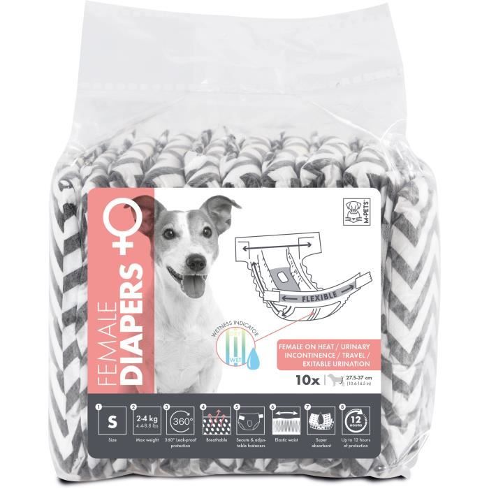 Couches pour chien - M PETS - DIAPERS - Femelle S x10 - Tour de taille 175-37 cm - 2-4 kg - Indicateur d’humidité - 12h protection