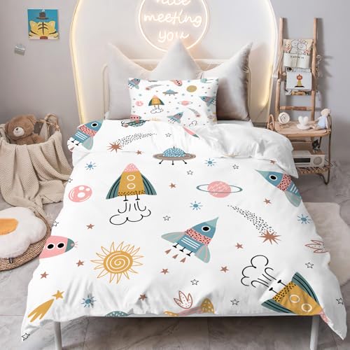 PNHCL Housse de Couette 100x140 Aérospatial Parure de Lit 1 Personne, Thème de l'espace Housse Couette avec 1 Taie d'oreiller pour Enfant Fille Garcon Deco Chambre, Dessin Animé Blanc