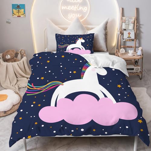 PNHCL Housse de Couette 100x140 Cheval Parure de Lit 1 Personne, Images de Dessins Animés Housse Couette avec 1 Taie d'oreiller pour Enfant Fille Garcon Deco Chambre, Animal Rose Bleu