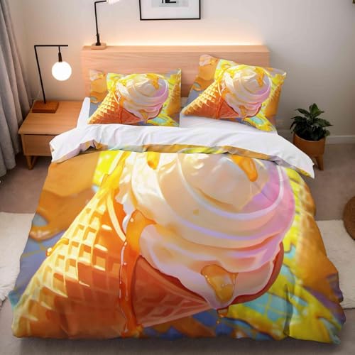 Housse de Couette 140x190 Glace Parure de Lit 1 Personne été 3D Microfibre Douce Housses de Couettes avec Fermeture Éclair avec 2 Taies d'oreillers 65x65 cm A-2654