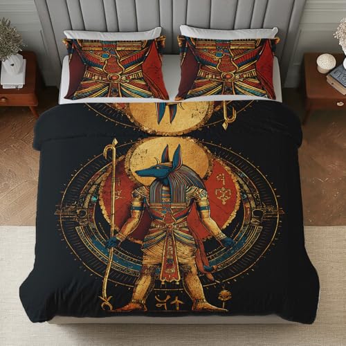 Générique Housse de Couette 140x190 Anubis, Microfibre Parure de Lit Motif Égyptien Tribal Réversible, avec Fermeture Éclair, 2 Taies d'oreiller 65x65 (2Ym374)