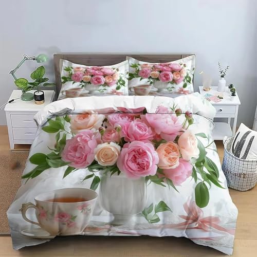Housse de Couette 140x190 Fleurs Roses 3D Parure de Lit Cœur Souriant en Microfibre Doux Housses Couettes 1 Personne avec Fermeture Éclair avec 2 Taies d'oreiller 65x65 cm F.2558