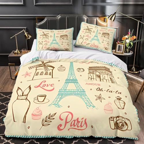 Housse de Couette 140x190 Tour Eiffel Parure de Lit 1 Personne Monuments Parisiens 3D Microfibre Douce Housses de Couettes avec Fermeture Éclair avec 2 Taies d'oreillers 65x65 cm A-2606