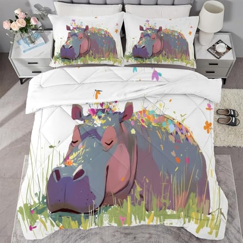 buyluhn Couette Hippopotame 140x190 4 Saisons, Couette Peint Imprimée 1 Personne pour Lit 90x190 Enfant, Edredon Duvet Ete Hiver avec 2 Taies d'oreiller, Lavable en Machine