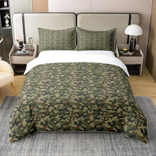 Housse de Couette 140x190 Camouflage Parure de Lit 1 Personnes Brun Verdâtre 3D Imprimée Doux Microfibre Literie 3 Pièces avec Fermeture Éclair et 2 Taies d'oreiller B-2613