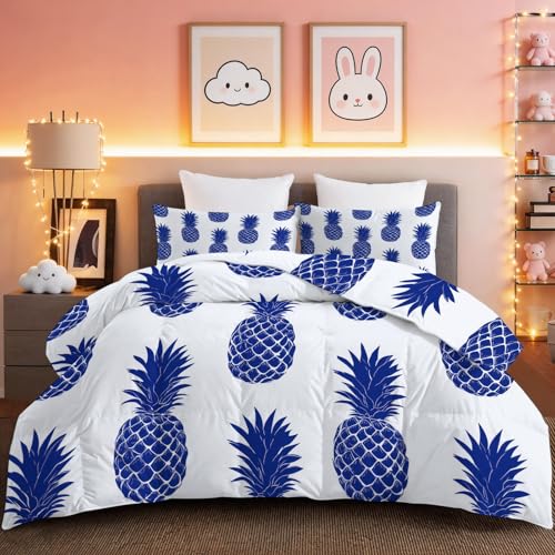 Générique Simple Couette 4 Saison 140x200cm, Fruit Ananas Réversible Matelassée Couettes Imprimée Blanc Bleu Foncé Couette 1 Personne, Douce Ensemble de Literie avec 2 Taies d'oreiller