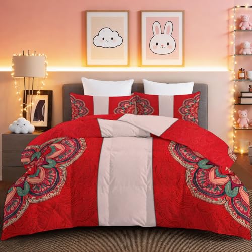 Générique Traditionnel Couette 4 Saison 200x200cm, Fleurs Inde Mandala Réversible Matelassée Couettes Imprimée Rouge Couette 2 Personnes, Douce Ensemble de Literie avec 2 Taies d'oreiller