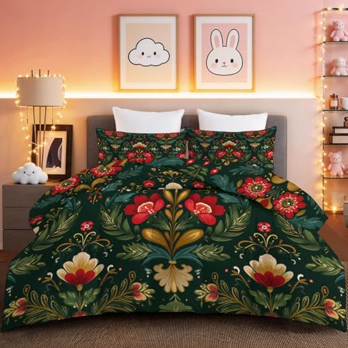 Générique Rétro Couette 4 Saison 140x200cm, Noël Fleur Plante Réversible Matelassée Couettes Imprimée Vert Foncé Couette 1 Personne, Douce Ensemble de Literie avec 2 Taies d'oreiller