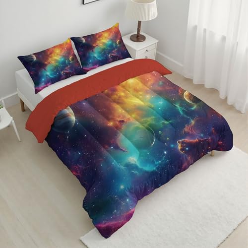 CDXNORA Couette Fantastique Univers 4 Saisons 140x200 cm, Couette Imprimée Espace Planètes Lavable en Machine pour lit 1 Personnes, Couettes Coloré Réversible sans Housse avec 1 Taies d'oreiller