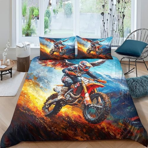 GPZFLDKQ Motocross Rider Housse de Couette 3 Pièces Microfibre résistante 3D Imprimée Respirante Cartoon Action Style Linge de Lit avec 2 x Taies d'oreiller Super Douce for Adulte Single(135x200cm)