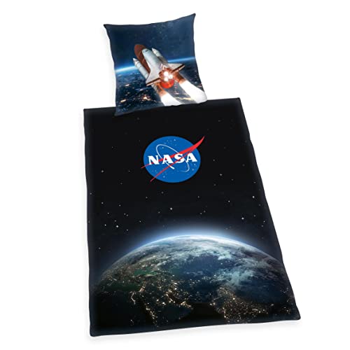 Herding Parure de Lit NASA, Taie d'oreiller 70 x 90 cm, Housse de Couette 140 x 200 cm, avec Fermeture Éclair Facile, 100% Coton/Renforcé, Noir
