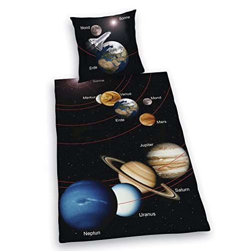 Herding YOUNG COLLECTION Parure de Lit, Réversible, Système Solaire, Housse de Couette 140 x 200 cm, Taie d'Oreiller 70 x 90 cm, Coton/Renforcé