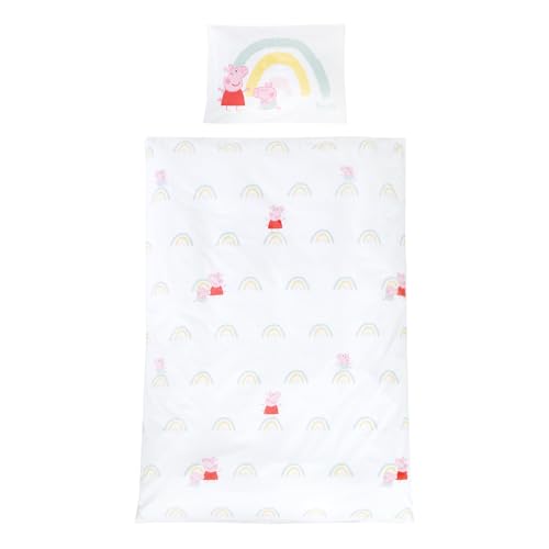 roba Peppa Pig Parure de Lit Enfant 60 x 120 et 70 x 140 cm - 2 Pièces 100% Coton - Housse de Couette 100 x 135 cm + Taie d'oreiller 40 x 60 cm - Motif Arc-en-Ciel - Blanc/Rose