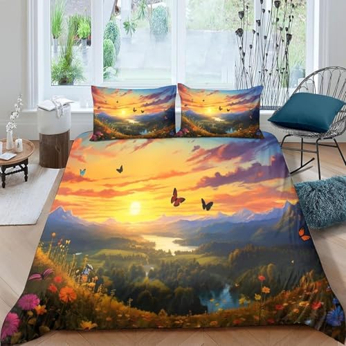 Housse de Couette 240x260 Fleurs Papillon Parure de Lit 3D Imprimée Douce Microfibre Duvet Cover 2 Personnes Coucher Soleil avec Fermeture éclair et 2 Taie d'oreiller 65x65 2555-C