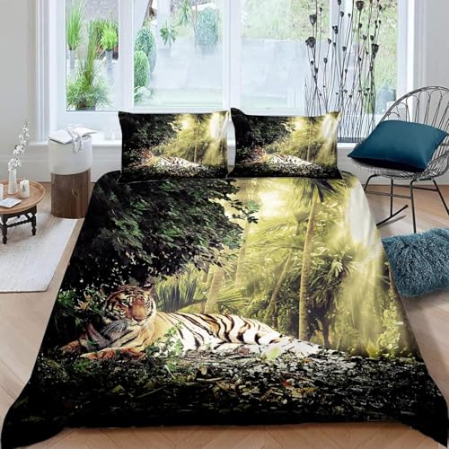 Housse de Couette 240x260 Tigre Parure de Lit 3D Imprimée Douce Microfibre Duvet Cover 2 Personnes Pelouse avec Fermeture éclair et 2 Taie d'oreiller 65x65 2435-C