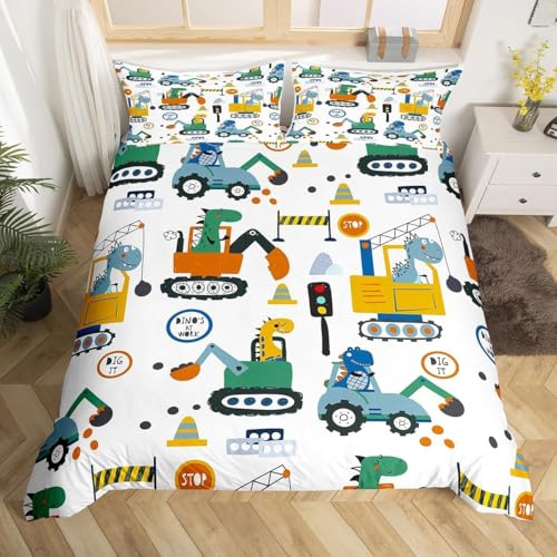 Homewish Housse de Couette Enfant 200x200 Excavatrice de Dessin Animé, Parure de Lit Enfant Ado Garçon Dinosaure Mignon, Sets de Housses de Couettes Réversible Équipement Camion, Couvre Lit Dinos
