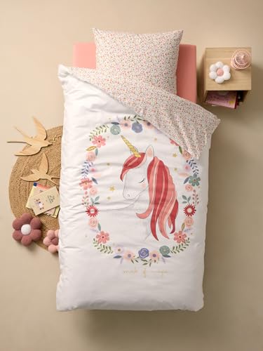 VERTBAUDET Parure Housse de Couette Enfant et taie d'oreiller Petite Licorne, avec Coton recyclé Blanc imprimé 140X200 63X63