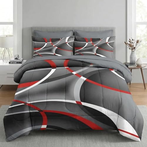 Couette Imprimée 200x200 Lignes Couette sans Housse Lavable Adulte Rouge et Blanc 2 Personne Édredon Chaude, Décoration - Edredon Microfibre Douce, 2 Taies d'oreiller 65x65 YUd1612
