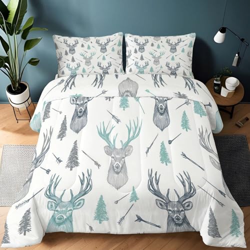 Couette Imprimée 200x200 cm Style Rétro Américain Élans Pins Couette en Duvet Gris Réversible - Édredon 2 Personnes Respirante Douce pour 4 Saisons - 2 Taies d'oreiller 65x65 cm - Machine