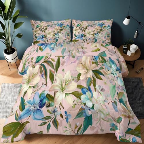 Couette Imprimée 200x200 cm Plante Floral Lys Couette en Duvet Rose Bleu Réversible - Édredon 2 Personnes Respirante Douce pour 4 Saisons - 2 Taies d'oreiller 65x65 cm - Machine