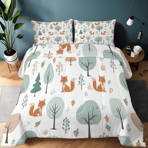 Couette Imprimée 200x200 cm Dessin Animé Renard Arbres Couette en Duvet Vert Orange Réversible - Édredon 2 Personnes Respirante Douce pour 4 Saisons - 2 Taies d'oreiller 65x65 cm - Machine