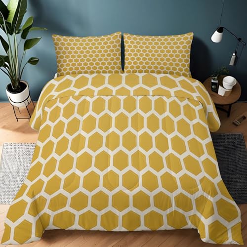 Couette Imprimée 200x200 cm Traditionnel Géométrique Hexagonal Nid d'abeille Couette en Duvet Jaune Réversible - Édredon 1 Personnes Respirante Douce pour 4 Saisons - 2 Taies d'oreiller 65x65 cm