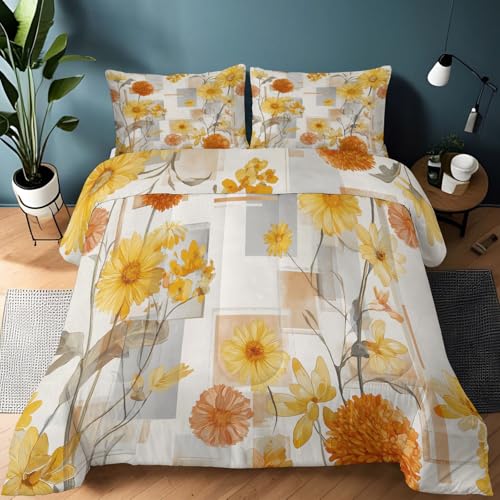 Couette Imprimée 200x200 cm Art Moderne Floral Géométrique Couette en Duvet Jaune Réversible - Édredon 2 Personnes Respirante Douce pour 4 Saisons - 2 Taies d'oreiller 65x65 cm - Machine
