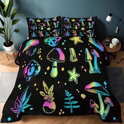 Couette Imprimée 200x200 cm Fantaisie Géométrie Champignons Étoiles Couette en Duvet Coloré Réversible - Édredon 2 Personnes Respirante Douce pour 4 Saisons - 2 Taies d'oreiller 65x65 cm - Machine