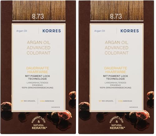 KORRES Colorant à l'huile d'argan - Sans ammoniaque - Golden Caramel 8.73 - Couverture 100% des cheveux gris et végétalien pour un résultat de couleur longue durée (Lot de 2)