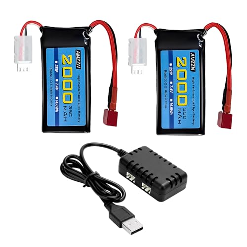 AMZZN 2PCS 7.4V 2000mah 35c 2S T-Plug lipo Batterie avec câble de Charge USB pour 300e 9200e 9201e 9206e M416 H16PL 903A HP162S HM124 RC Voiture télécommande Bateau Drone Jouet Voiture Batterie