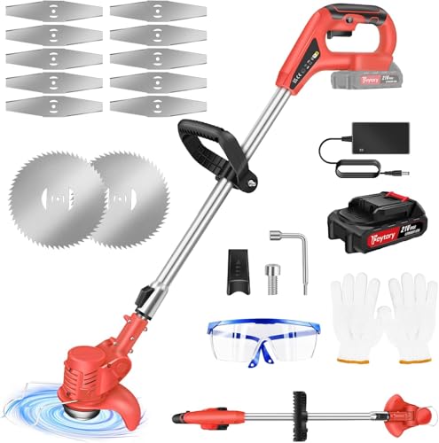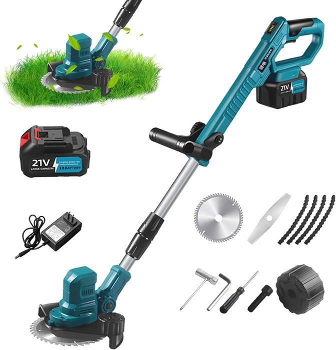 Débroussailleuse Batterie 21V Coupe Bordure sans Fil avec Batterie, Chargeur, 10 Lames Métalliques et 2 Lames de Scie Circulaire, Taille Bordure pour la Coupe de Jardin Pelouses et Terres Agricoles
