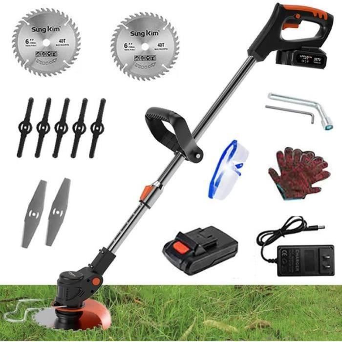 MEVRONISSHOP-Débroussailleuse Électrique sans Fil, Coupe-Bordure sans Fil avec Batterie, avec Chargeur Inclus, Lame Droite et Lame Courbée Dentée, Poignée Réglable, idéale pour Jardin, pelouse et Cha