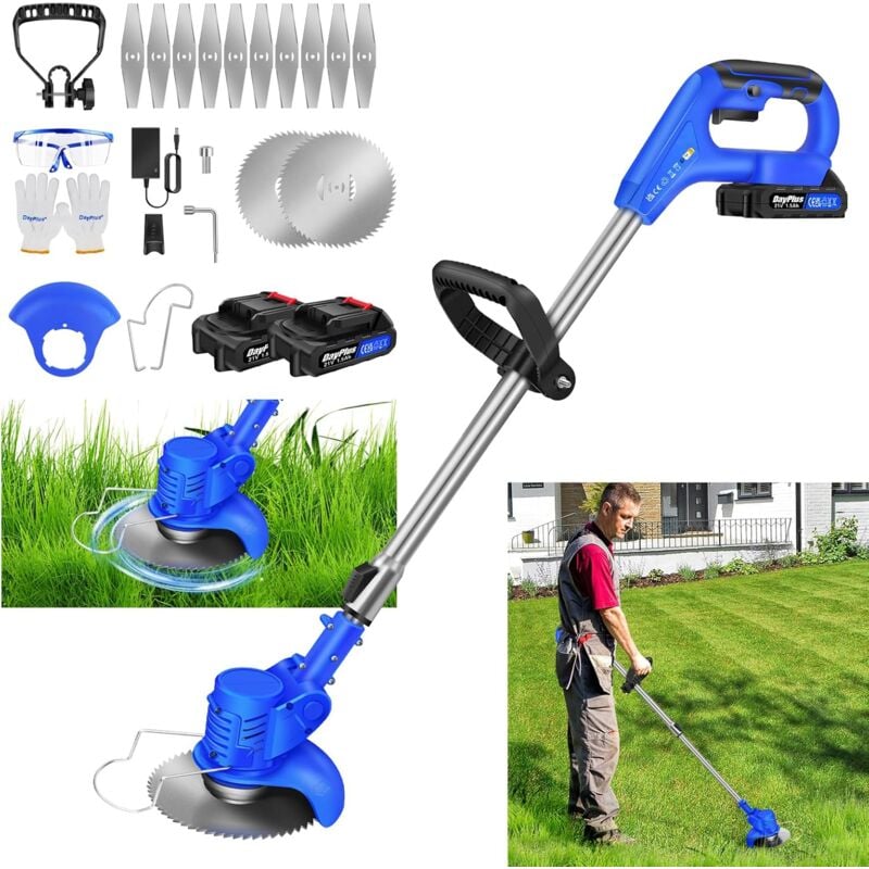Coupe-Herbe sans Fil 2 en 1, Coupe-Bordure sans Fil (Installation Facile, Manche télescopique en continu, 10 Lames métalliques incluses) Livré avec Batterie 2X 1,5 Ah et Chargeur, Bleu