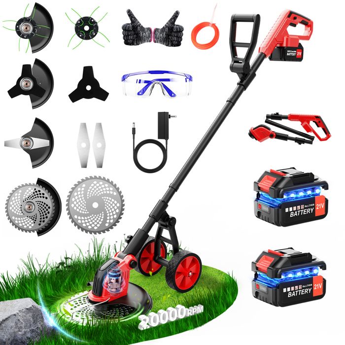 DéBroussailleuse à Electrique sans Fil 21V 2.0Ah Coupe Bordure sans Fil avec 2 Batterie et Chargeur Rapide Taille Bordure avec Roues Trois Types De Lames,légères et à Faible Bruit,pour Jardin Élagage