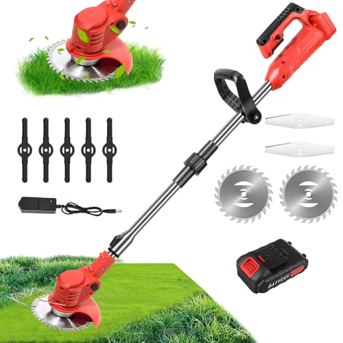 Coupe Bordure sans Fil avec- Batterie Débroussailleuse Electrique sans Fil avec- 2 pièces Batterie et 3 Types de Lames, pour la Coupe de Jardin, Pelouses et Terres Agricoles Rouge