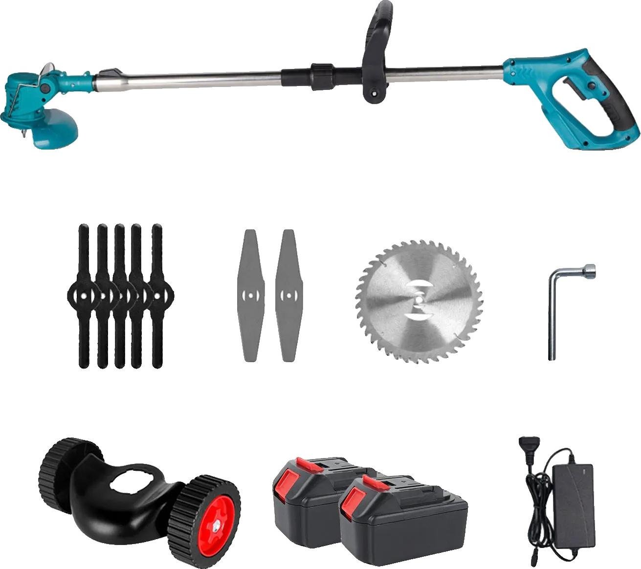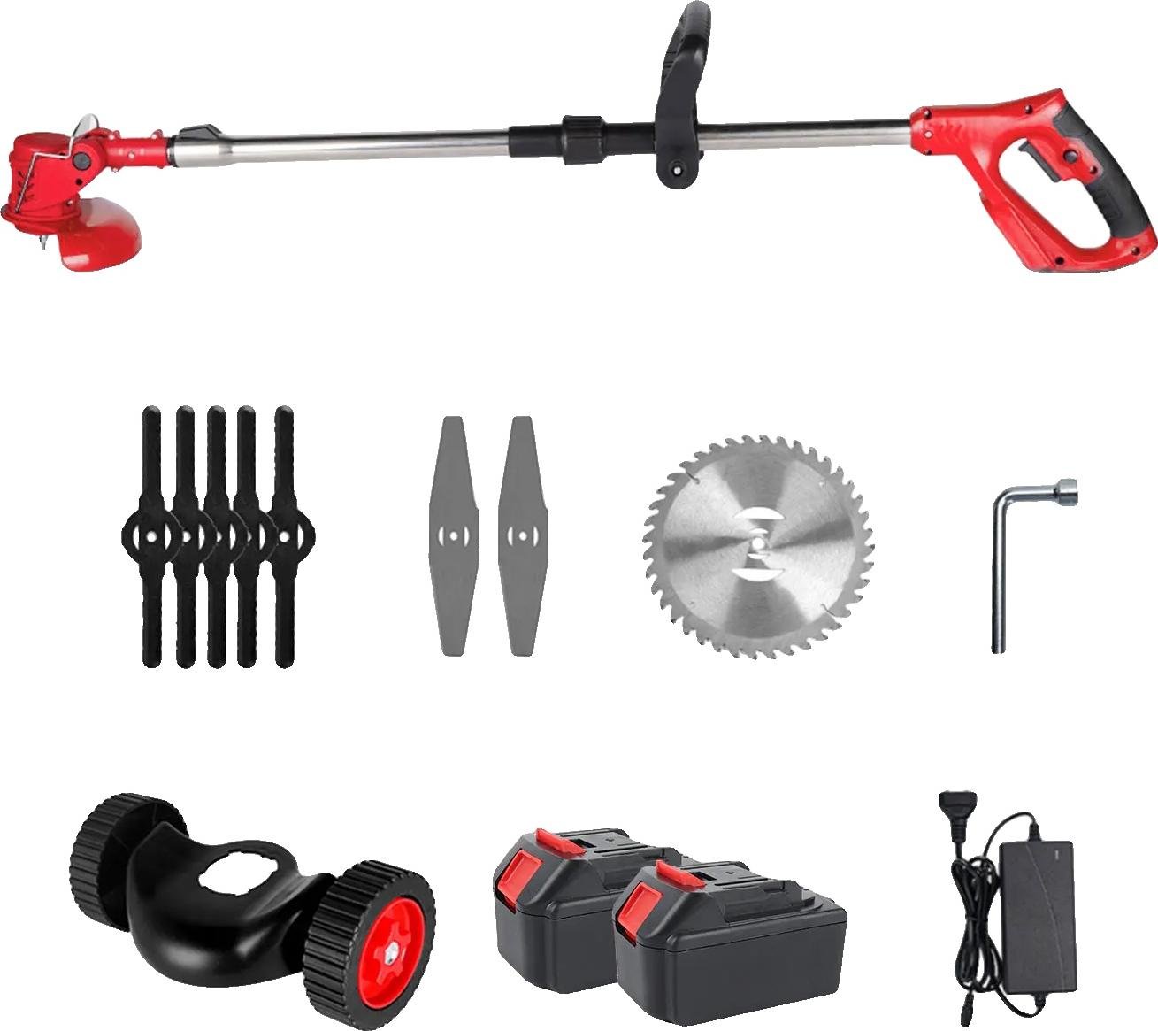 Debroussailleuse Electrique sans Fil, 21V Coupe Bordure, avec 1 Batterie et Chargeur Taille Bordure, avec 3 Types de Lames pour la Coupe de Jardin Pelouses et Terres Agricoles (avec Roues-Deux Piles)