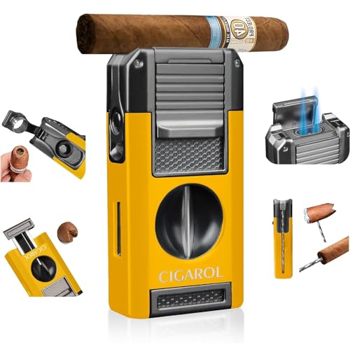 CIGARLOONG Ensemble Coupe Cigare et Briquet Double Lame et Briquet Butane Rechargeable à Jet(Jaune2)