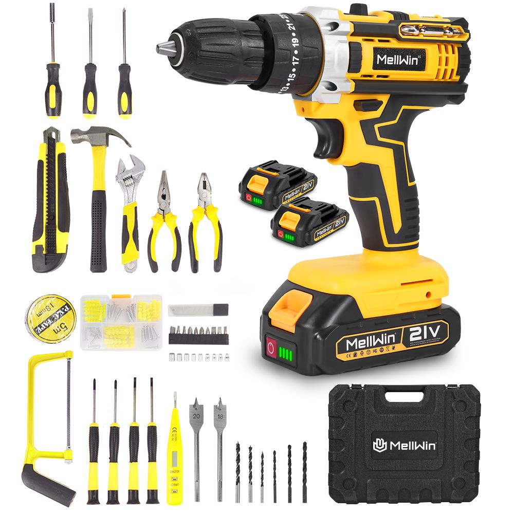 Perceuse Visseuse à percussion sans fil 21V,45N.m ,25+3 Réglages de Couple,Visseuse Devisseuse San Fil Multifonctionnelle avec 45 Accessoires, 2 Vitesses