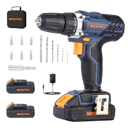 MAXPRO Perceuse Visseuse Sans Fil, Visseuse Devisseuse Sans Fil 18V avec 2 Batteries 1.5Ah, 2 Vitesses (0-350/1350 tr/min), 18+1 Réglages de Couple, Chargeur 1.5A, with LED Light