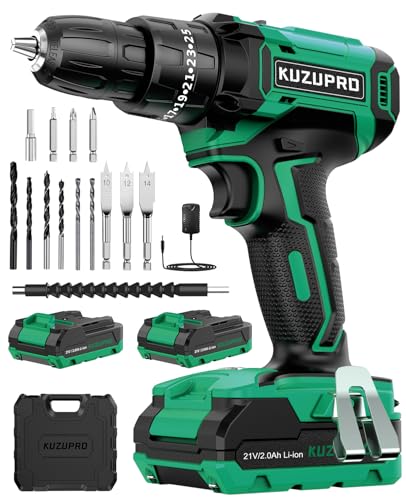 KUZUPRO Perceuse Visseuse Sans Fil 21V, Visseuse Devisseuse avec 2 Batteries 2.0Ah, 42Nm Percussion, 25+3 Réglages de Couple, 14 Accessoires, 2 Vitesses, LED, pour la Bricolage