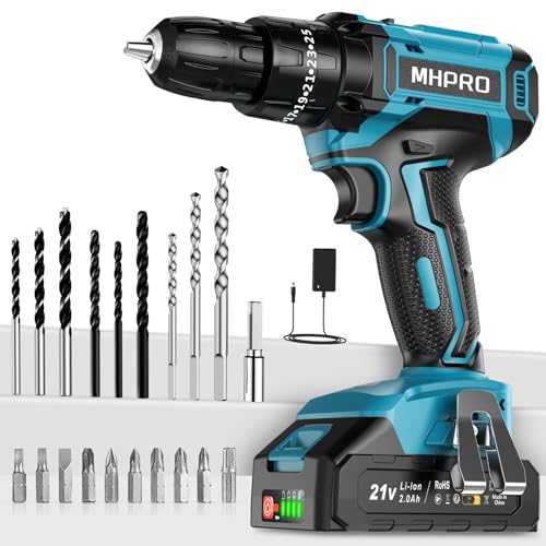 MHPRO Perceuse Visseuse Sans Fil 21V, Visseuse Devisseuse avec 2 Batteries 2.0Ah, 42Nm Percussion, 25+3 Réglages de Couple, 14 Accessoires, 2 Vitesses, LED, pour la Bricolage