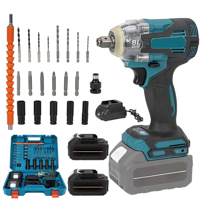 Clé à chocs électrique Clé à chocs à couple 1200N.m Visseuse a Choc Sans Fil perceuse électrique de 1/2 pouces 2 batteries