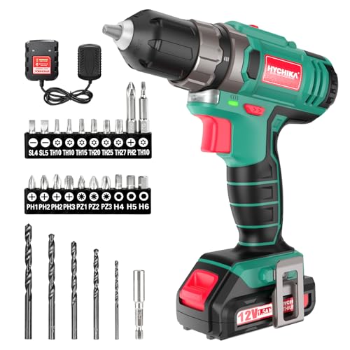 HYCHIKA Perceuse Visseuse Sans Fil 12 V, Visseuse Devisseuse Sans Fil 30 N.m, 21 + 1 Réglages de Couple, 2 Vitesses Réglables, 26 Accessoires,Lumière LED, pour la Bricolage