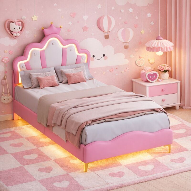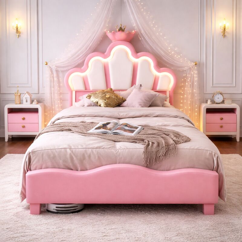 Lit Enfant Capitonné 90x200 cm avec LED pour Fille Adolescent- Tête de Lit Réglable en Hauteur, Sommier à Lattes, Design Couronne de Princesse en PU,