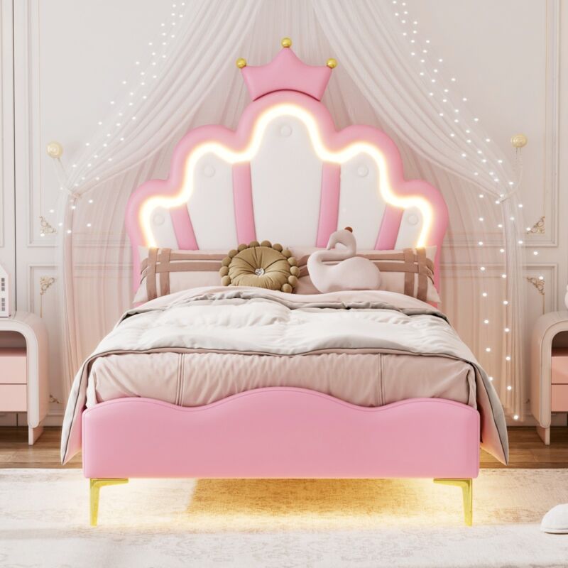 Lit simple 90x200cm - Lit Princesse Couronne avec Sommier à Lattes et LED Réglables - PU - Rose