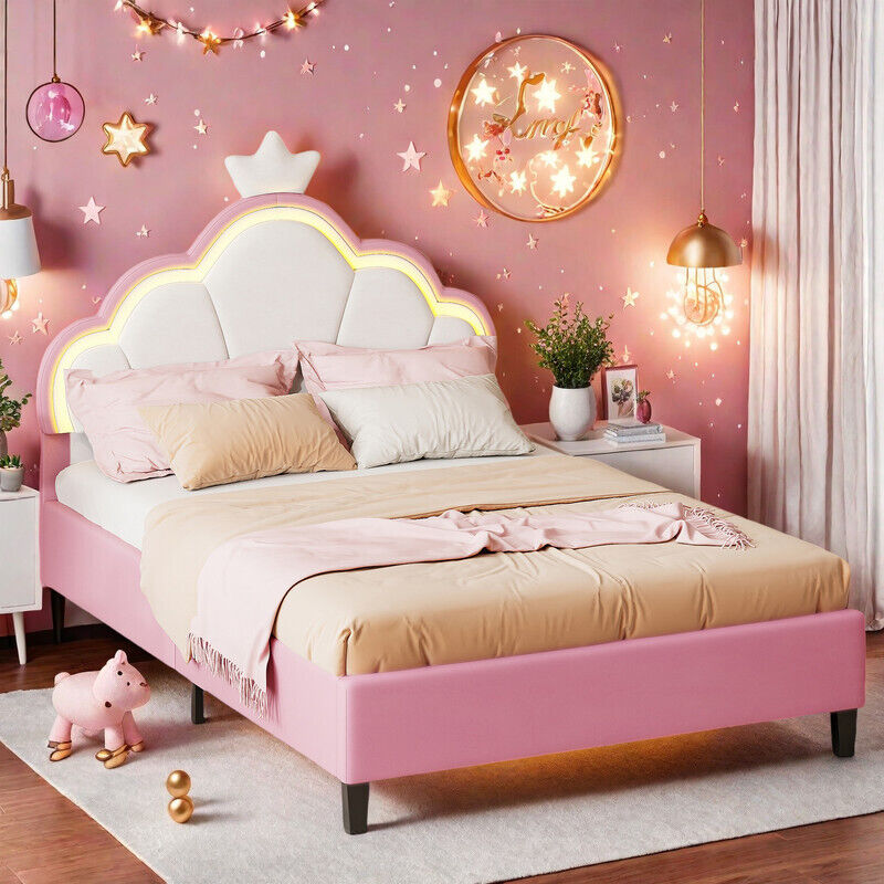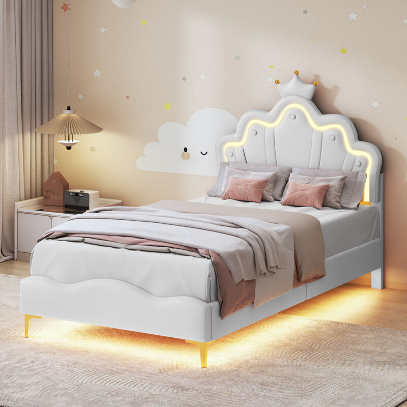 Lit Enfant 90x200, Lit Fille avec Bandes LED, Lit Adolescente Fille, Lit 1 Personne, Lit Couronne Princesse avec Tête de Lit en Forme de Nuage,