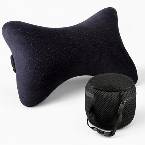 Aeris Coussin de Nuque de Voiture avec Sangle réglable et Sac Portable en Mousse à mémoire de Forme de qualité supérieure pour Avions, Bus, Trains, Housse Amovible et Lavable en Machine (Noir)