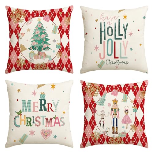 Artoid Mode Ensemble de 4 housses de coussin Rouge Diamant Plaid Casse-noix Arbre Joyeux Noël, 40x40 cm Housse de coussin de Noël Décorative Coussin de Canapé Déco