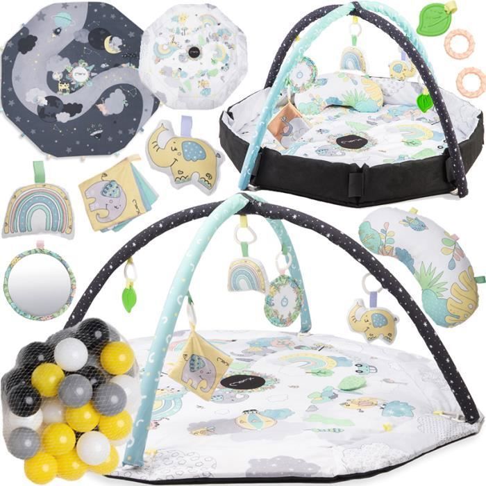 MoMi DAY&NIGHT – Tapis d’Éveil Bébé 3-en-1 Réversible – Piscine à Balles – Jouets Sensoriels – Coussin – Multicolore